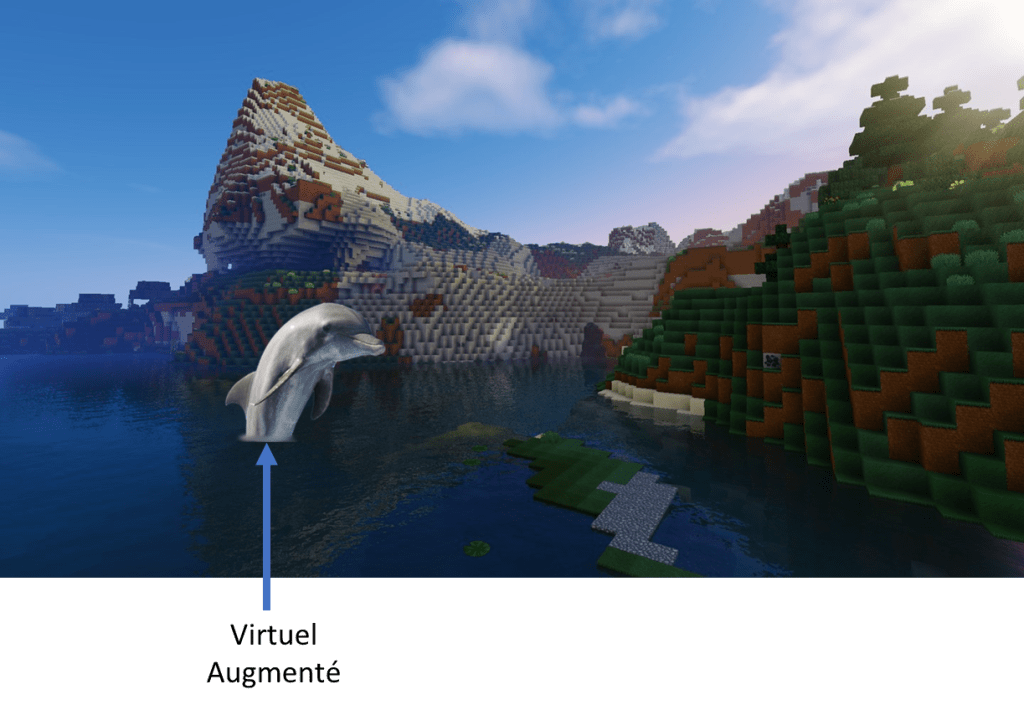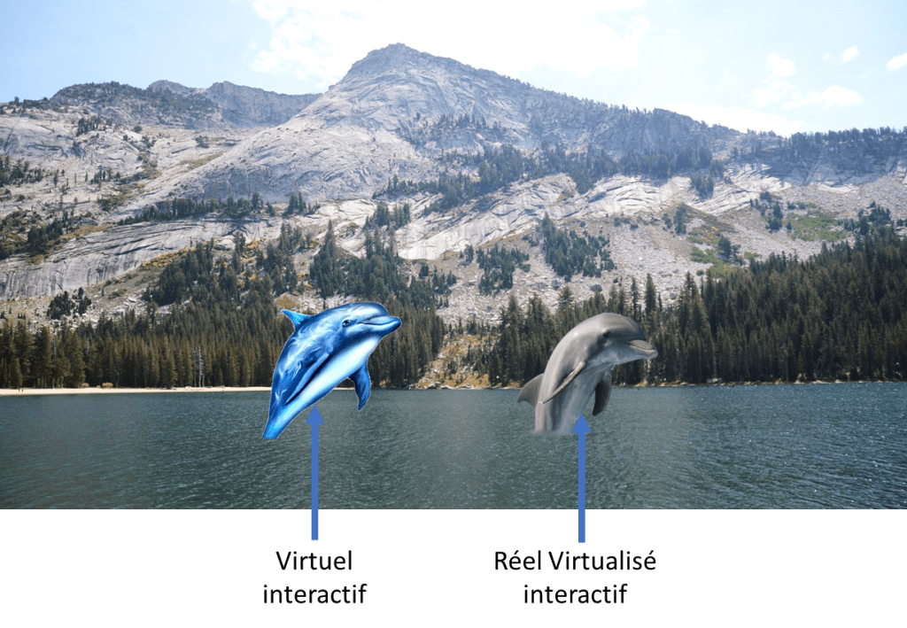 - Réalité mixte (MR) : A la différence de l’AR, la réalité mixte va permettre l’interaction de nos objets virtuelles avec la réalité. Si je crée un dauphin en 3D et qu’il interagit virtuellement avec l’eau on pourra parler de MR. D’autre part, si des objets réelles sont scannés en 3D et rajouté dans notre espace virtuel pour interagir avec le monde il s’agira aussi de réalité mixte.